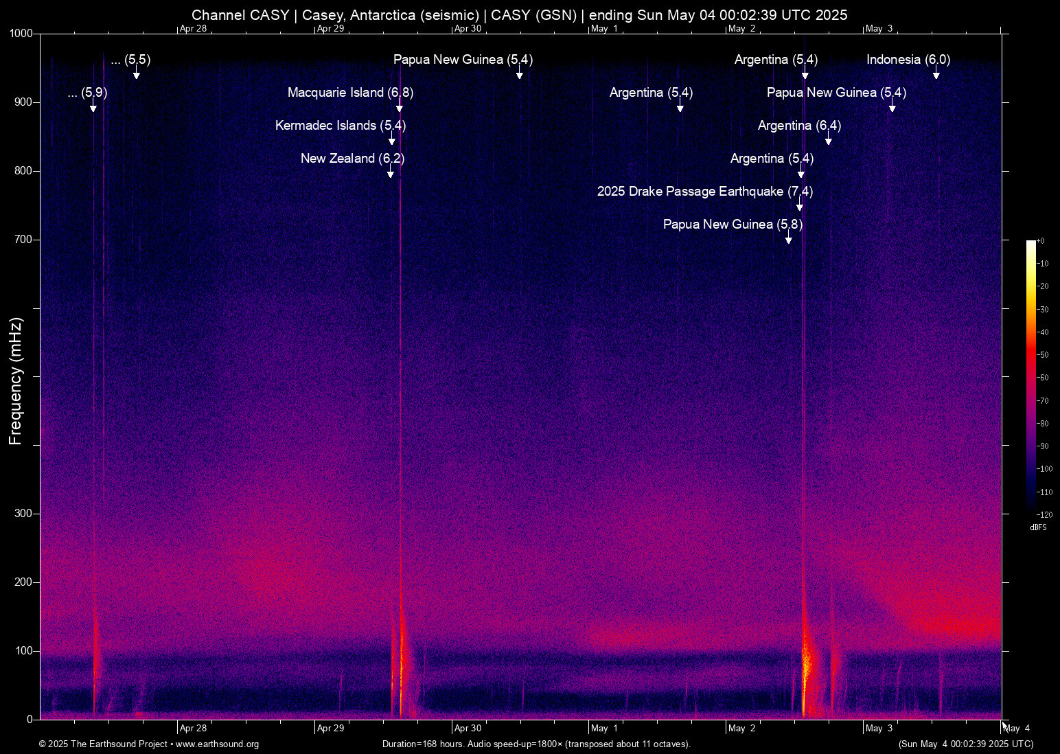 Fri May 2 13:07:45 2025 5.4 -56.79 -68.10 5 Argentina (220 km S of Ushuaia, Argentina)