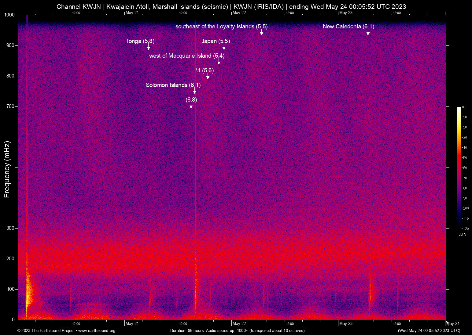 Sun May 21 15:45:13 2023 6.1 161.44 -10.27 6 Solomon Islands (55 km WNW of Kirakira, Solomon Islands)