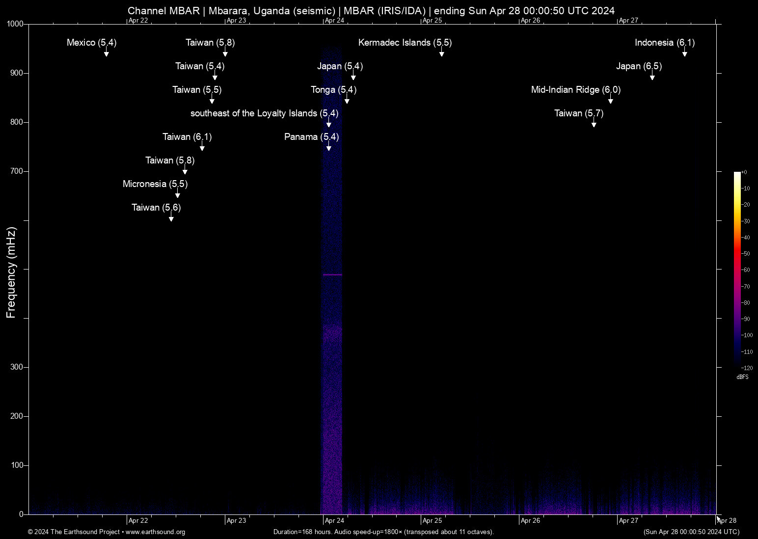 Mon Apr 22 18:26:53 2024 6.1 121.64 23.72 6 Taiwan (28 km S of Hualien City, Taiwan)