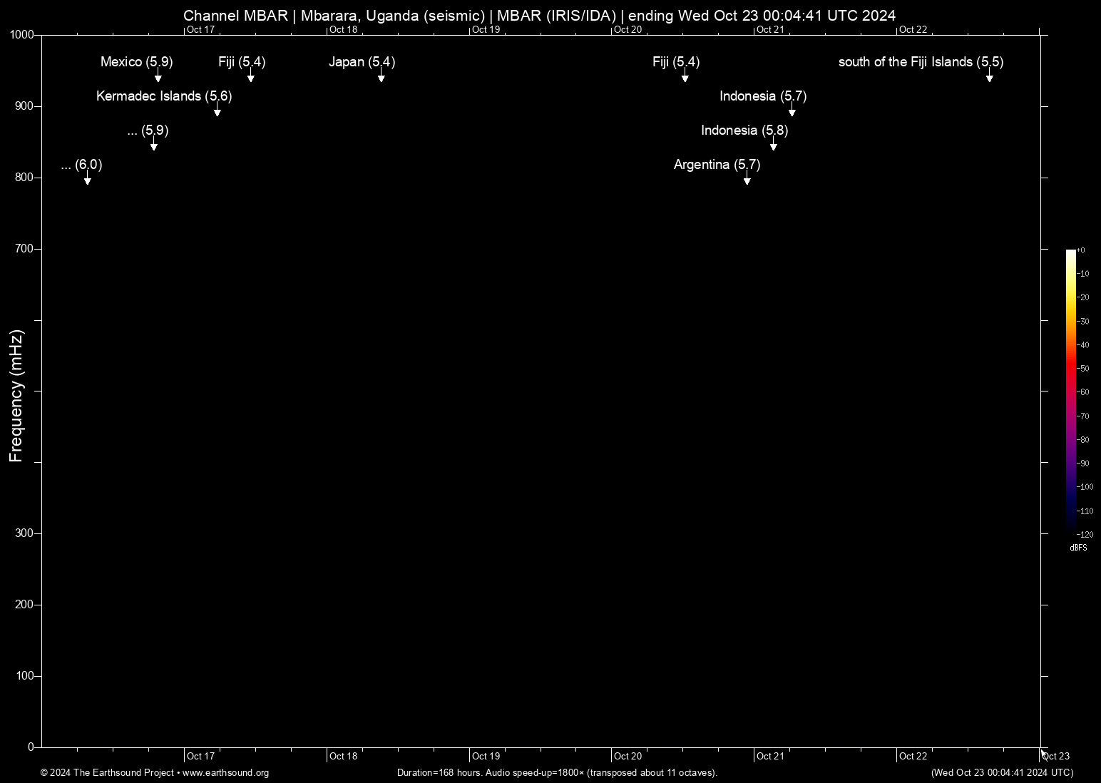 Sun Oct 20 22:59:40 2024 5.7 -68.75 -30.89 6 Argentina (63 km NNW of Albardón, Argentina)