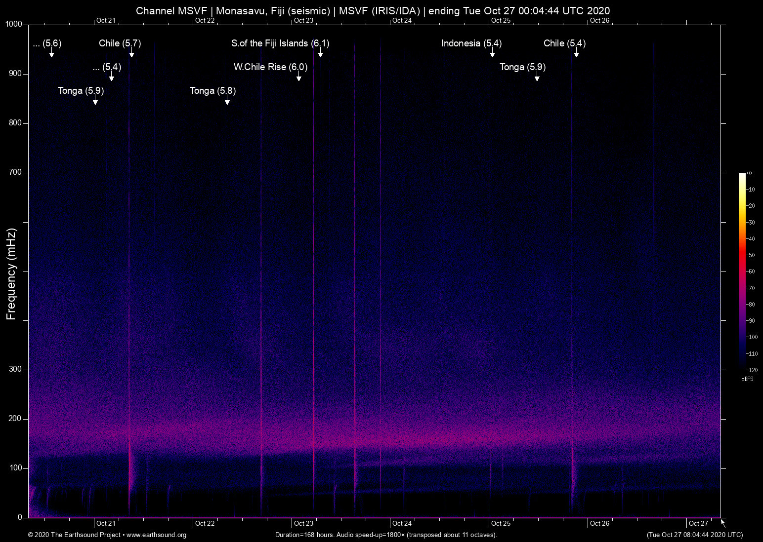 Sun Oct 25 14:17:15 2020 5.4 -70.89 -20.02 5 Chile (80 km WNW of Iquique, Chile)