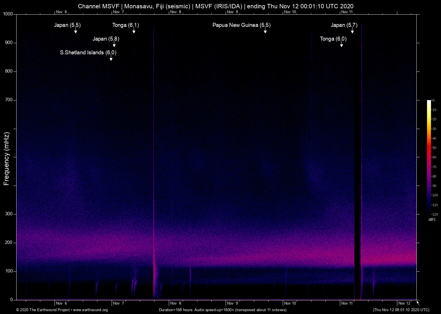 Sat Nov 7 01:27:04 2020 6.1 -173.56 -15.27 6 Tonga (79 km NNE of Hihifo, Tonga)