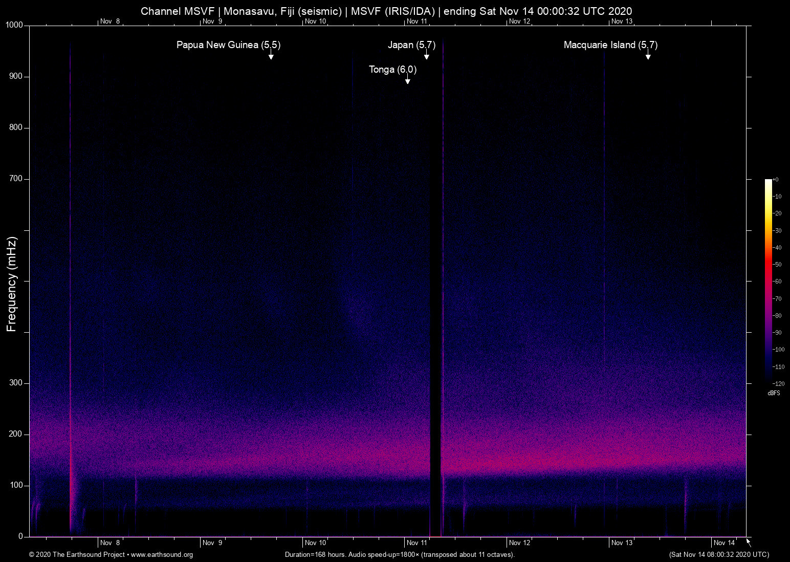Sat Nov 7 01:27:04 2020 6.1 -173.56 -15.27 6 Tonga (79 km NNE of Hihifo, Tonga)