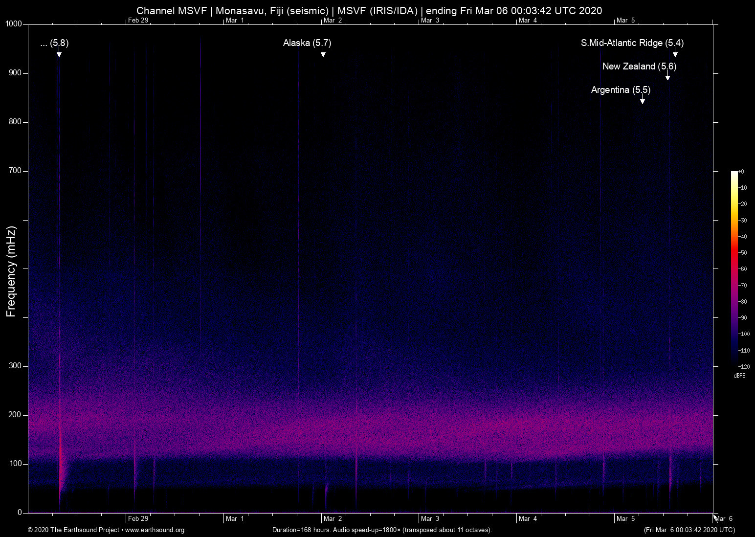 Thu Mar 5 13:11:46 2020 5.6 -176.27 -29.77 6 New Zealand (168km ESE of Raoul Island, New Zealand)