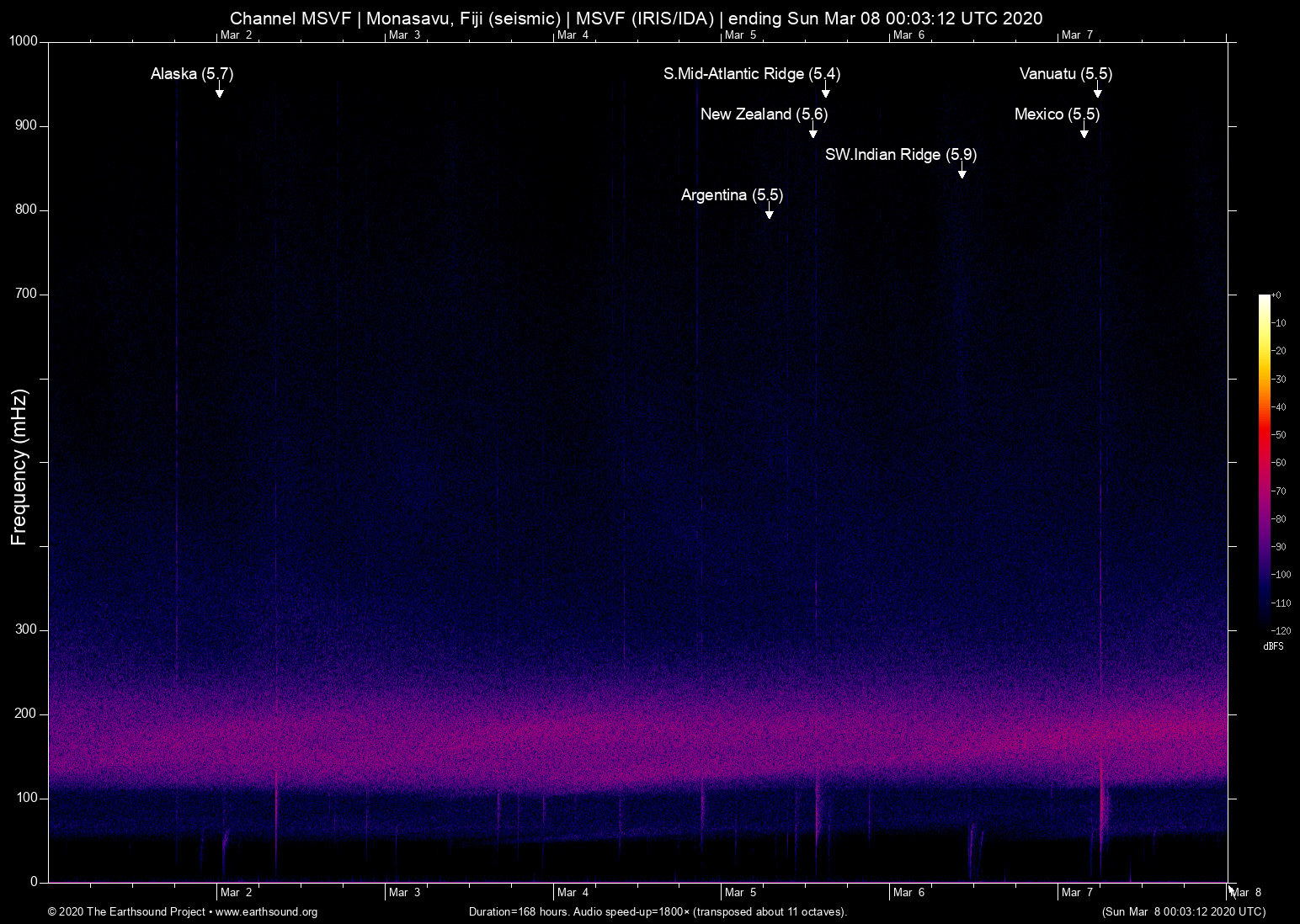 Thu Mar 5 13:11:46 2020 5.6 -176.27 -29.77 6 New Zealand (168km ESE of Raoul Island, New Zealand)