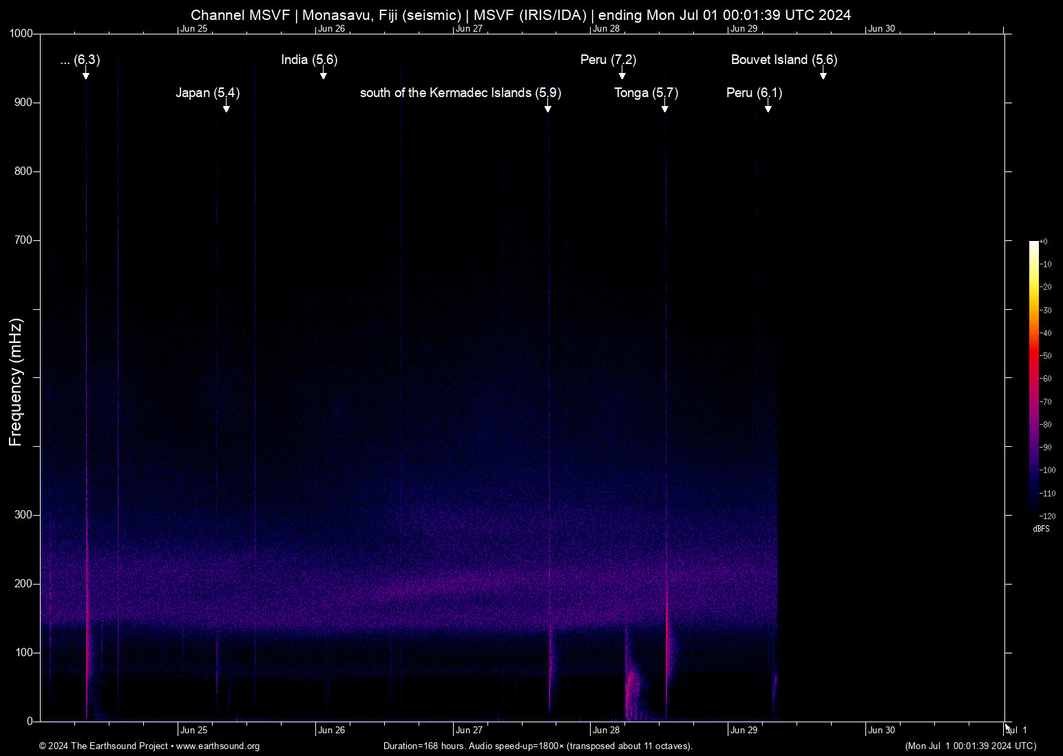 Fri Jun 28 05:36:37 2024 7.2 -74.44 -15.81 7 Peru (8 km W of Atiquipa, Peru)
