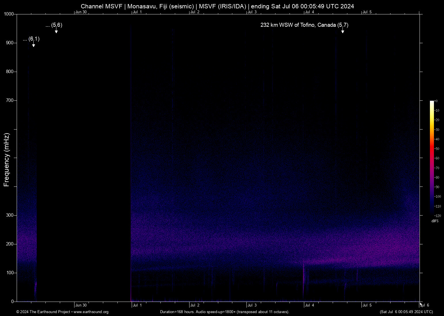 Thu Jul 4 16:15:08 2024 5.7 -129.00 48.68 6 232 km WSW of Tofino, Canada