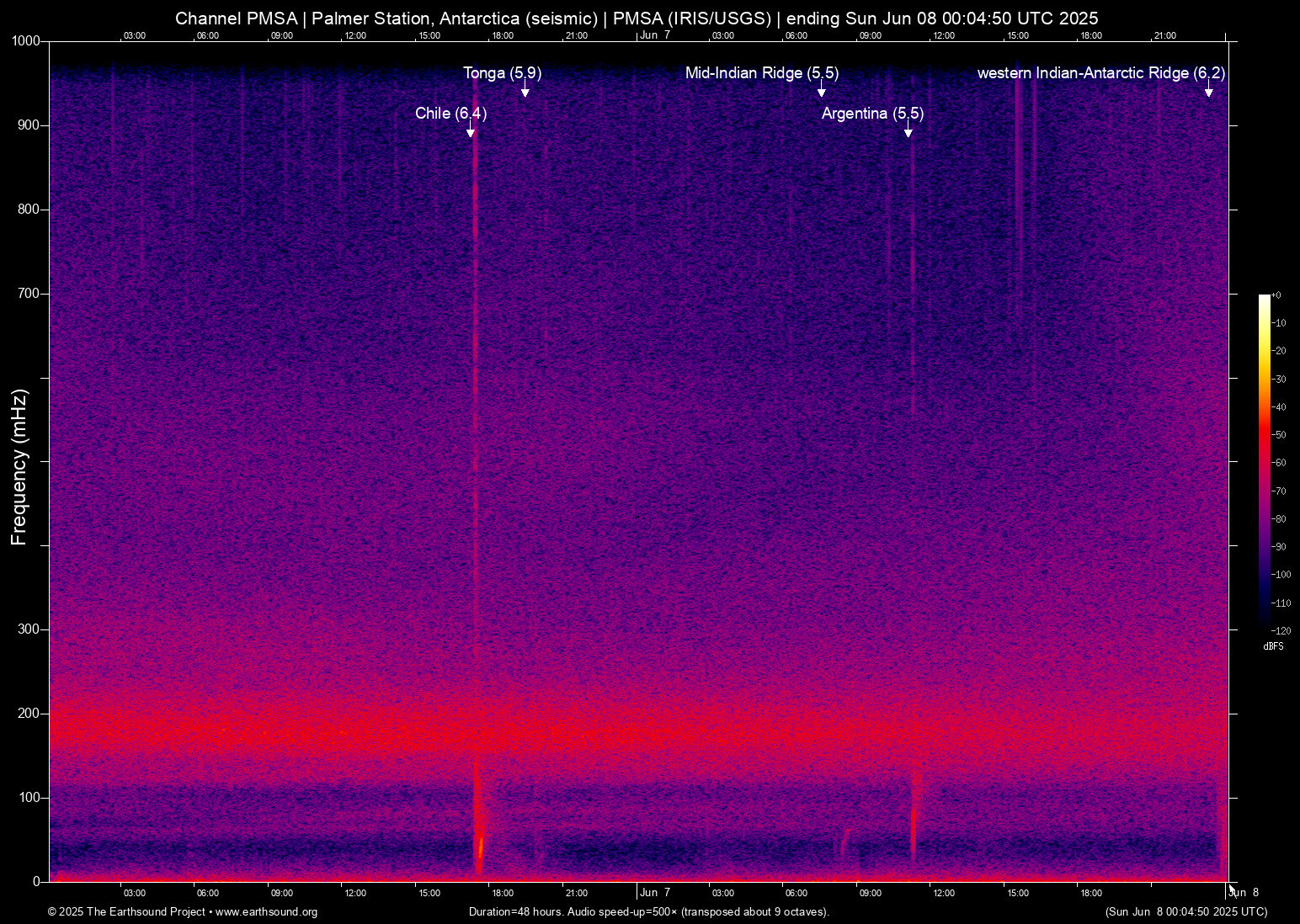 Sat Jun 7 11:06:04 2025 5.5 -57.25 -66.70 6 Argentina (289 km SSE of Ushuaia, Argentina)