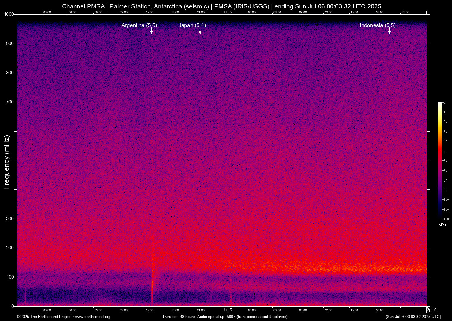 Fri Jul 4 15:47:46 2025 5.6 -57.02 -67.33 6 Argentina (253 km SSE of Ushuaia, Argentina)