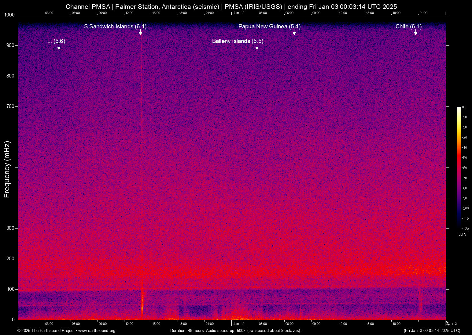 Thu Jan 2 20:43:35 2025 6.1 -69.13 -21.71 6 Chile (84 km NNW of Calama, Chile)