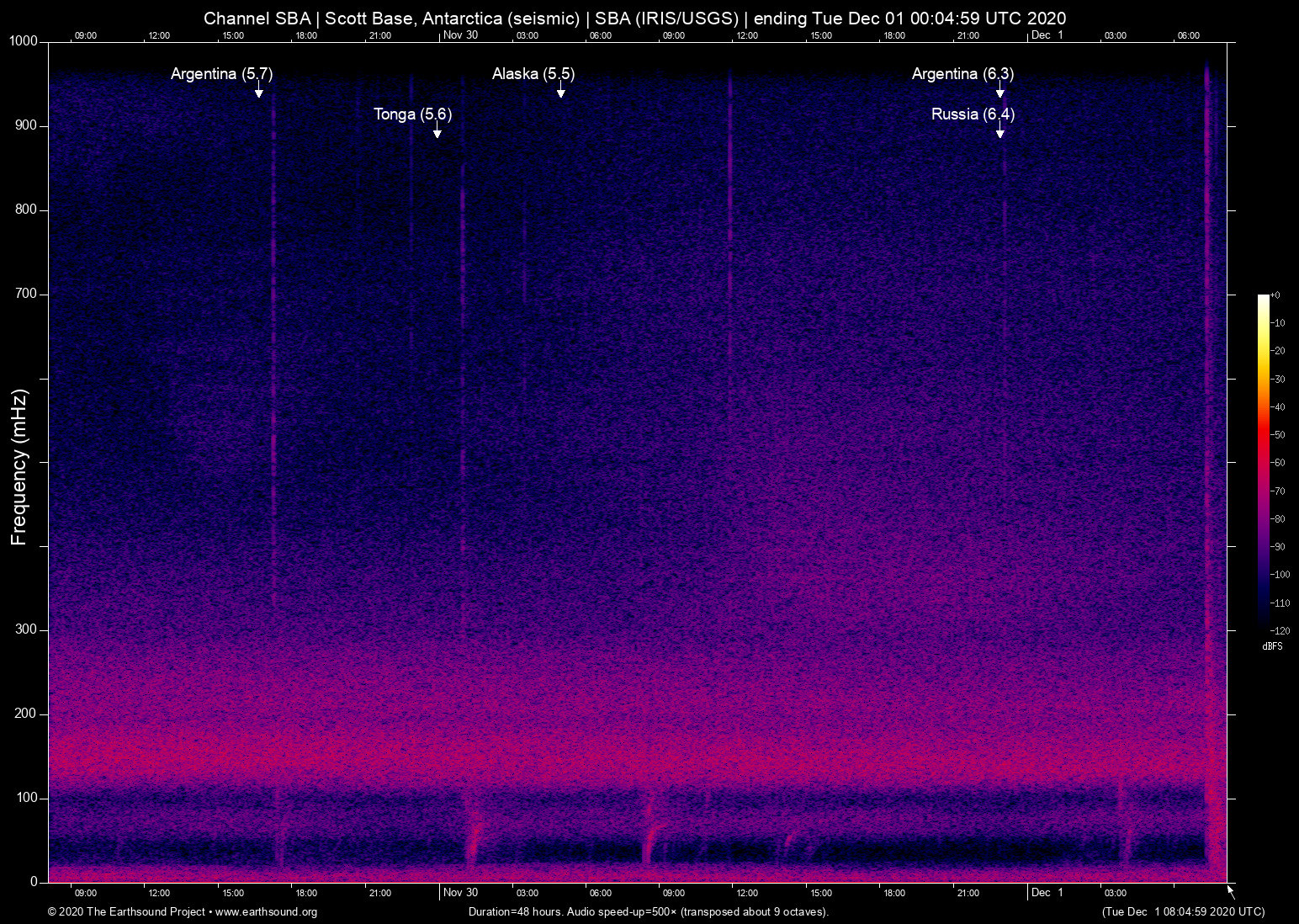 Sun Nov 29 20:59:09 2020 5.5 -168.36 52.73 6 Alaska (40 km SE of Nikolski, Alaska)