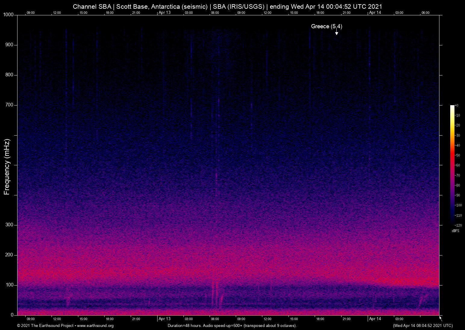 Tue Apr 13 13:28:02 2021 5.4 27.08 36.48 5 Greece (15 km SSW of MandrĂ¡ki, Greece)
