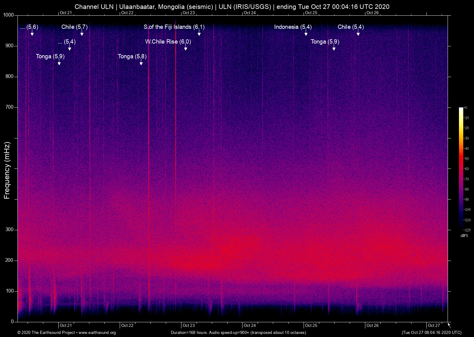 Sun Oct 25 14:17:15 2020 5.4 -70.89 -20.02 5 Chile (80 km WNW of Iquique, Chile)