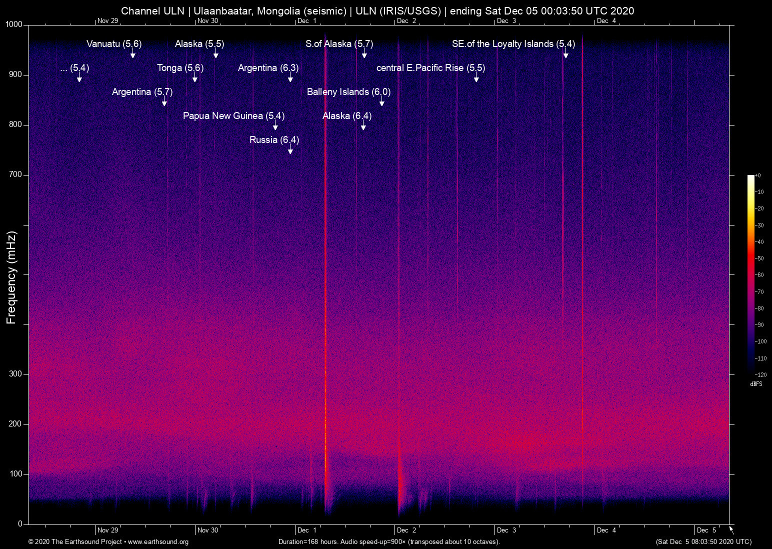 Tue Dec 1 08:22:39 2020 6.4 -168.30 52.78 6 Alaska (41 km ESE of Nikolski, Alaska)