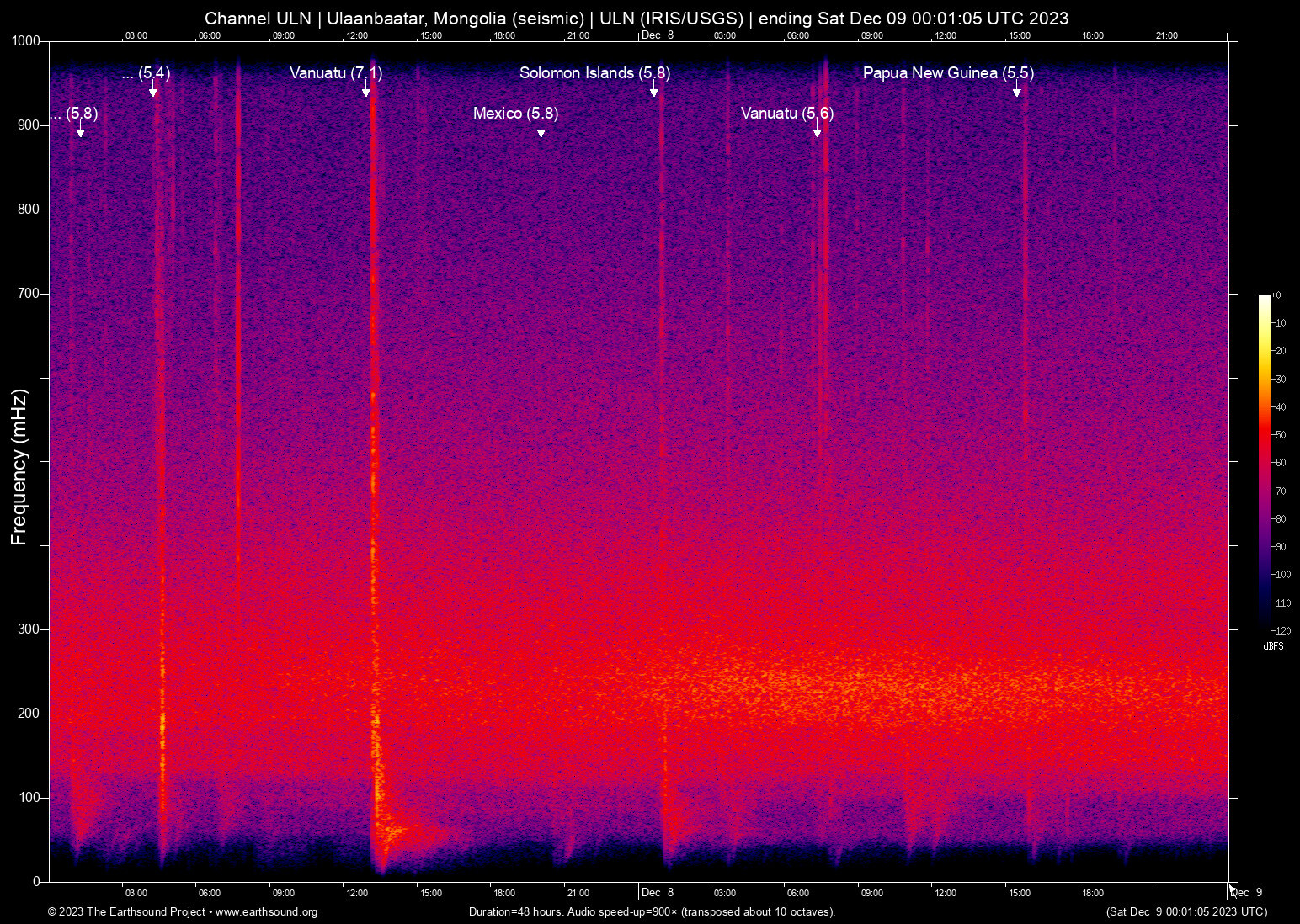 Thu Dec 7 12:56:30 2023 7.1 169.21 -20.66 7 Vanuatu (123 km S of Isangel, Vanuatu)