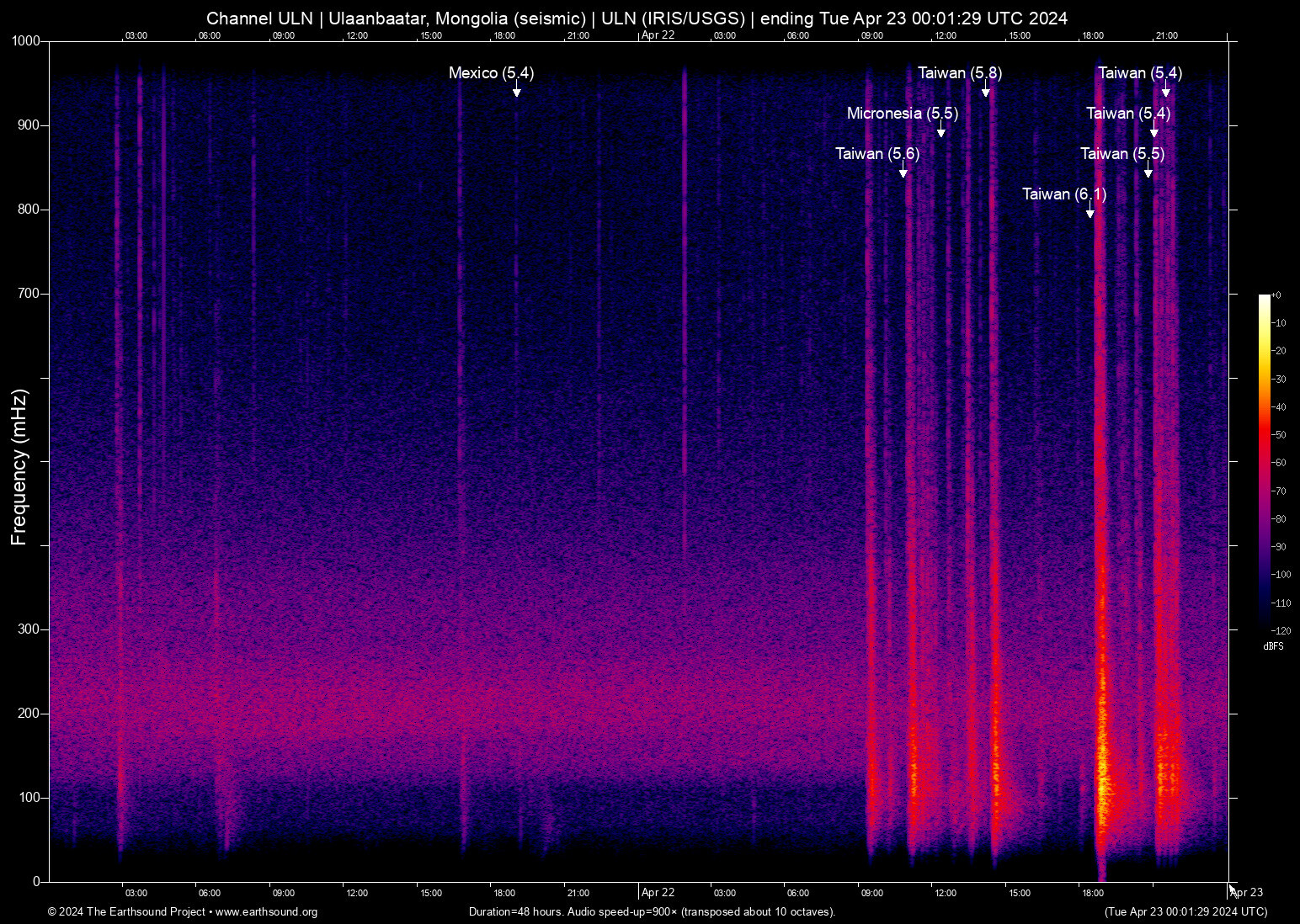 Mon Apr 22 18:26:53 2024 6.1 121.64 23.72 6 Taiwan (28 km S of Hualien City, Taiwan)