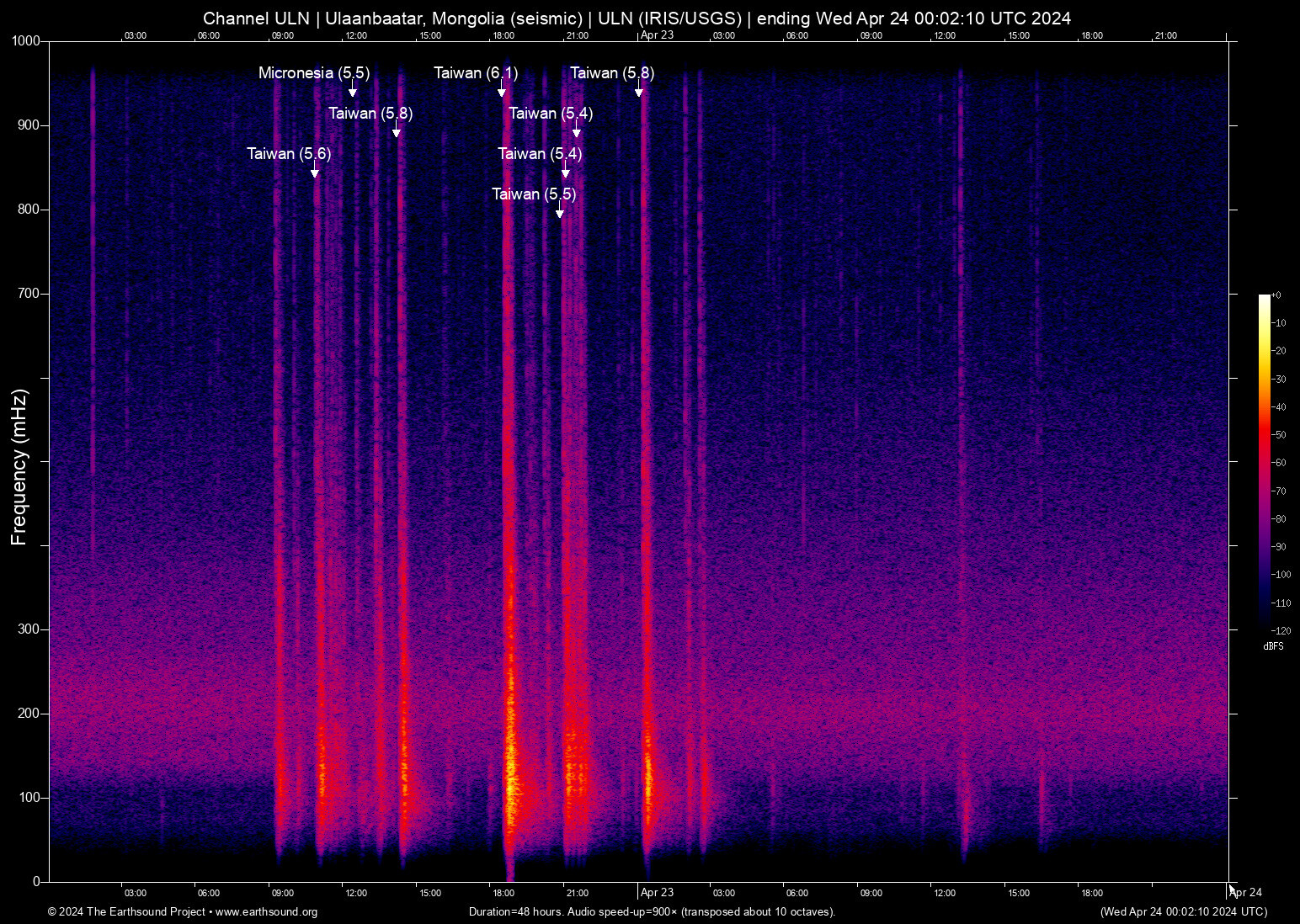 Mon Apr 22 21:04:21 2024 5.4 121.57 23.70 5 Taiwan (31 km S of Hualien City, Taiwan)