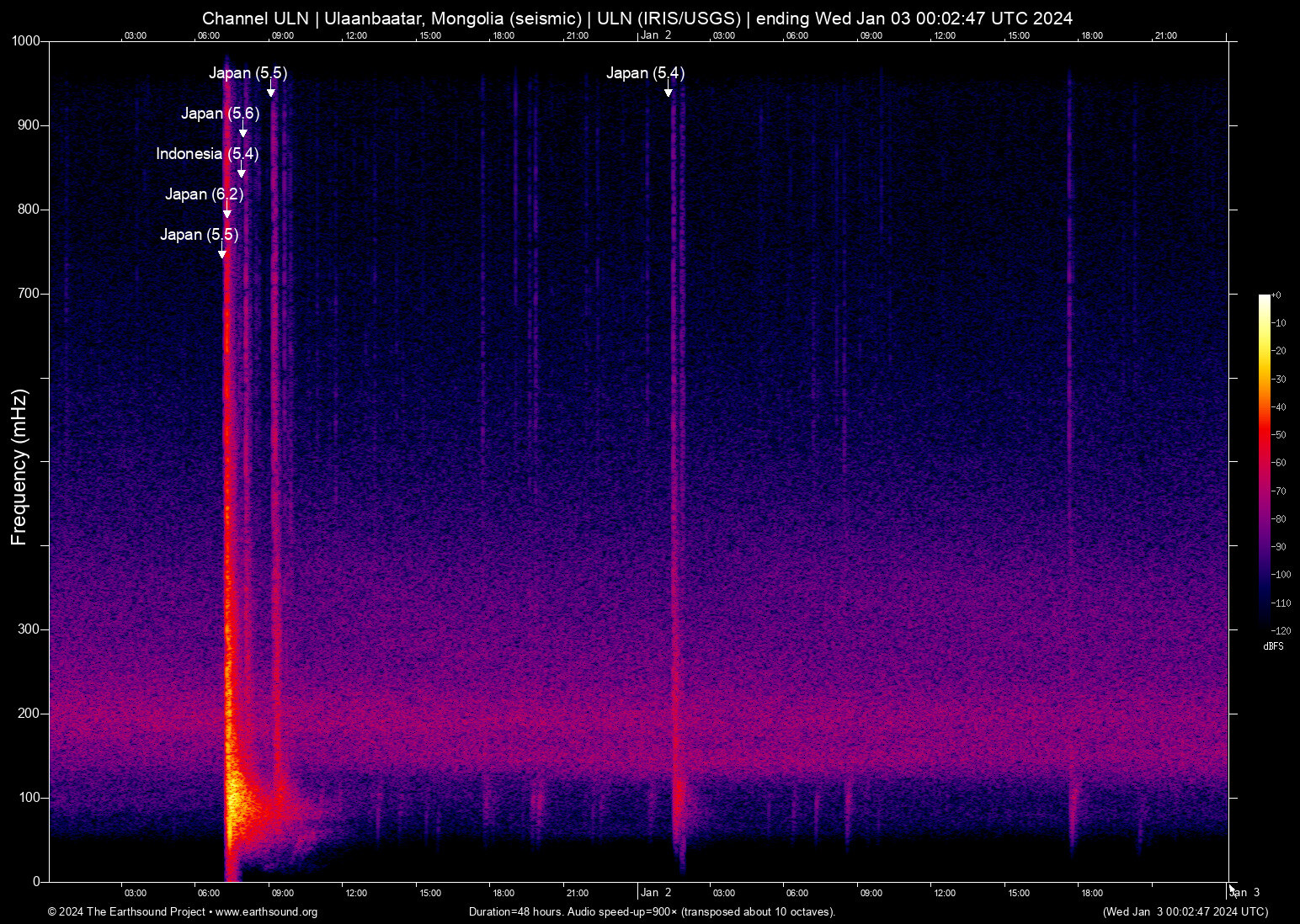 Mon Jan 1 09:08:17 2024 5.6 137.41 37.52 6 Japan (55 km NE of Anamizu, Japan) *